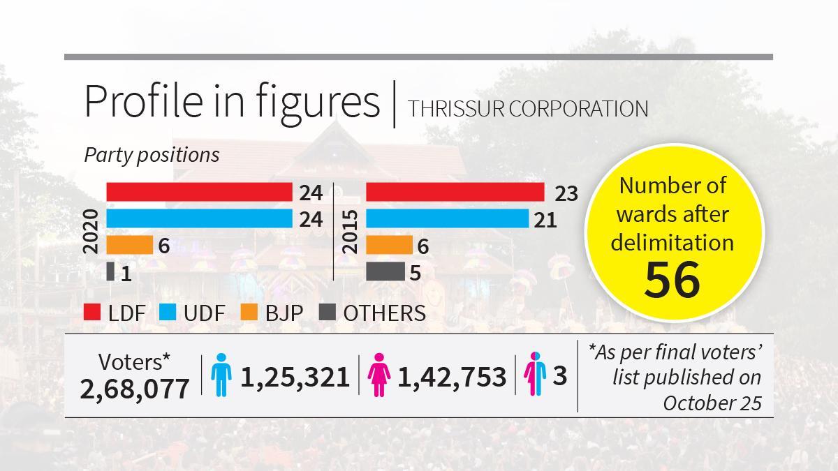 38+ min ago (426+ words) Updated - December 01, 2025 09:44 am IST - Thrissur The same suspense that sweeps through the crowd during Kudamattom at Thrissur Pooram'that anticipation of what comes next'now grips the city's politics. Will there be a change of guard at the Thrissur'Corporation'in the upcoming local polls? Thrissur, long dubbed the "glamour'Corporation" of Kerala politics, is expected to witness a fierce contest among the Left Democratic Front (LDF), United Democratic Front (UDF), and the Bharatiya Janata Party (BJP) ' each determined to claim control. After delimitation, the'Corporation'has expanded from 55 to 56 divisions and the Mayor post is reserved for women in the upcoming election. For the past five years, the LDF held the reins of the'Corporation'with the backing of Mayor M.K. Varghese, a Congress rebel. In the 2020 elections, the BJP clinched six of the 55 divisions, with the remaining split evenly between the LDF and the UDF with 24 seats each,…...